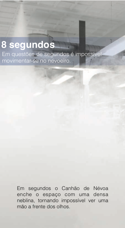 A Névoa de Segurança é extremamente eficaz para complementar o sistema de alarme convencional e evitar assaltos e vandalismo. No denso nevoeiro, o intruso fica imediatamente desorientado. Sentindo-se cercado pela densa neblina, o assaltante procura imediatamente sair pelo mesmo local por onde entrou, sem roubar ou danificar as instalações. A experiência adquirida em milhares de instalações demonstra que o Sistema de Névoa de Segurança é o método anti-roubo mais eficaz do mercado.